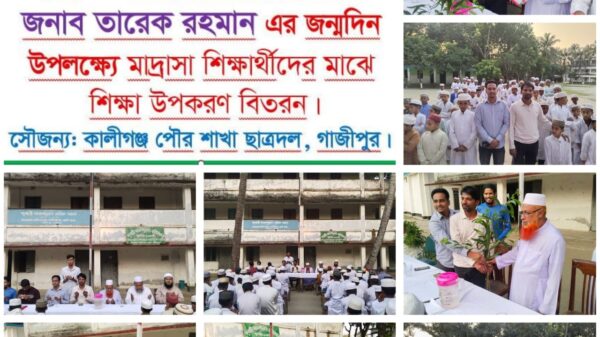 কালীগঞ্জ প্রতিনিধি: বিএনপির ভারপ্রাপ্ত চেয়ারম্যান জনাব তারেক রহমানের জন্মদিন উপলক্ষে কালীগঞ্জ পৌরসভার বিভিন্ন মাদ্রাসা শিক্ষার্থীদের মাঝে শিক্ষা উপকরণ বিতরণ দোয়ার আয়োজন করেন কালীগঞ্জ পৌর শাখা ছাত্রদল,দোয়া শেষে মাদ্রাসার শিক্ষক দের