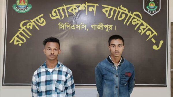 গাজীপুর প্রতিনিধি: গাজীপুরে গলাকেটে গৃহবধুকে হত্যা ও তার স্বামীকে গুরুতর আহত করার ঘটনায় জড়িত সন্দেহে পাশের কক্ষের ভাড়াটিয়া টিকটকার দুই যুবককে গ্রেফতার করেছে র্যাব এর সদস্যরা। রবিবার দুপুরে র্যাব-১ এর অতিরিক্ত পুলিশ সুপার (ভারপ্রাপ্ত মিডিয়া) রাকিব হাসান বিষয়টি নিশ্চিত করেছেন। গ্রেফতারকৃতরা হলো কুড়িগ্রাম জেলার উলিপুর উপজেলার নন্দু নেপড়া গ্রামের আব্দুল হাকিমের ছেলে আইনুল ইসলাম বুলেট (২২) এবং বাগেরহাট জেলার কচুয়া উপজেলার গজারিয়া গ্রামের আলতাফ হোসেনের ছেলে রাজীব (২০)। এদের মধ্যে আইনুল ইসলাম বুলেটকে নরসিংদী