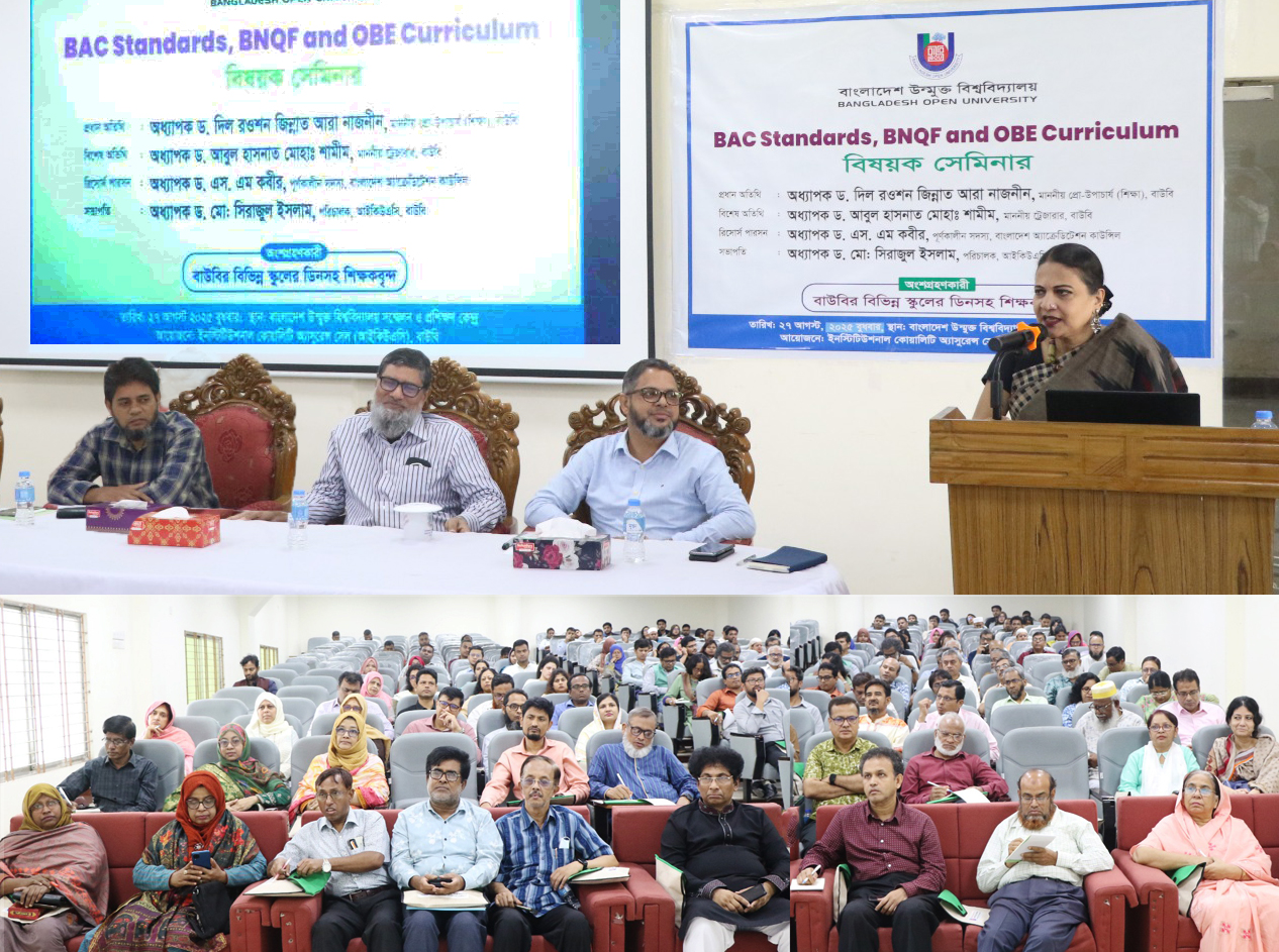 গাজীপুর প্রতিনিধি: বাংলাদেশ উন্মুক্ত বিশ্ববিদ্যালয়ের (বাউবি)-তে “BAC Standards, BNQF and OBE Curriculum” শীর্ষক দিনব্যাপী এক সেমিনার অনুষ্ঠিত হয়েছে। বুধবার (২৬ আগস্ট), সকাল সাড়ে ১০ টায় বিশ্ববিদ্যালয়ের গাজীপুর ক্যাম্পাসের কেন্দ্রীয় সম্মেলন ও